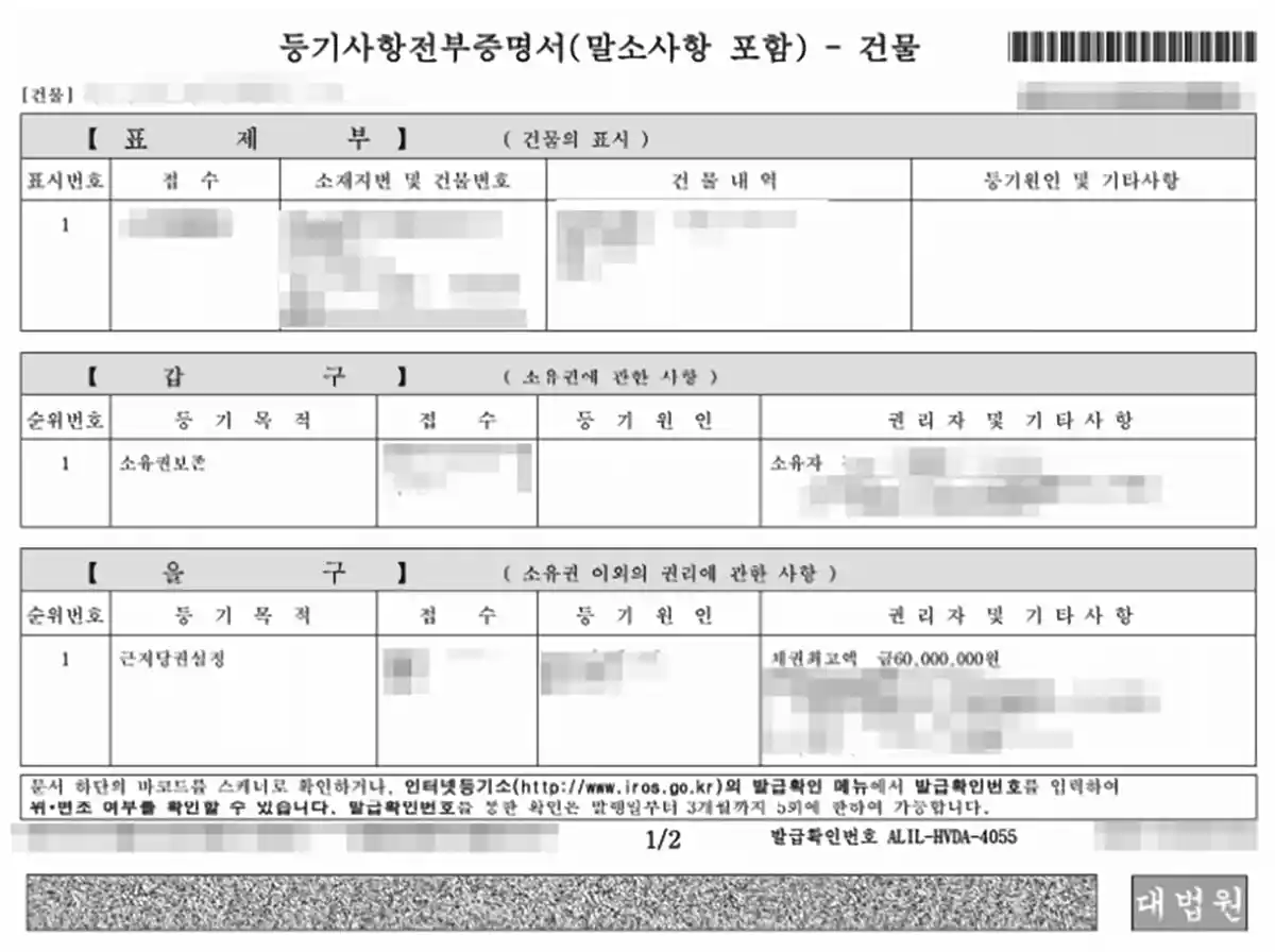 부동산 계약을 진행할 때 등기부등본을구내용을 파악할 수 있어야 안전한 집을 판단할 수 있습니다. 물론 갑구의 가압류나 가등기 등이 있으면 계약을 하지 않으면 되지만 을구의 근저당권은 대부분 부동산 거래에 있어서 포함되어 있기 때문에 기본적인 내용은 숙지하고 계시는 걸 추천합니다.