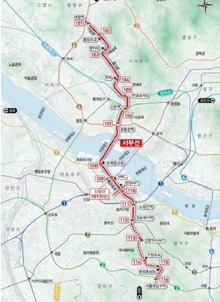 - 정차역 : 새절역(101 )~백련산입구(102)~명지대입구(103)~연희(104)~연세대(105)~신촌(106)~관흥창(107)~서여의도(108)~한국거래소(109)~동여의도(110)~노량진(111)~장승배기(112)~신상도(113)~현대시장(114)~은천(115)~서울대입구(116)