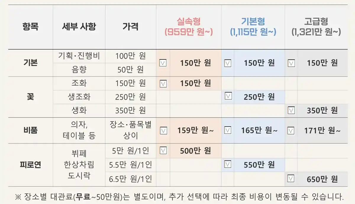 하지만 기획 및 진행비, 꽃, 비품, 피로연 등의 세부사항에 대해서는 실속형, 기본형, 고급형으로 나눠 가격을 저렴하게 책정하고 있습니다.