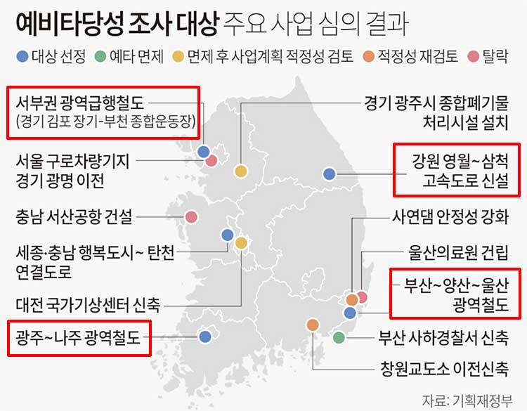 이번에 예비타당성으로 포함된 사업은 영월~삼척 간 고속도로 1곳과 부산~양산~울산 광역철도, 광주~나주 광역철도, 서부권 광역급행철도 3곳이 선정되었습니다.