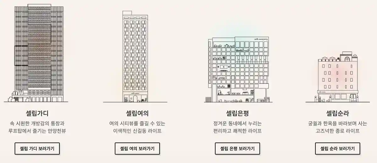 셰어하우스우주에서 운영 중인 브랜드 셀립은 지난 8월부터 가산 모비우스 타워 코리빙하우스 셀립 가디의 운영을 시작했고 셀립여의, 셀립은평, 셀립순라의 지점들이 있습니다.