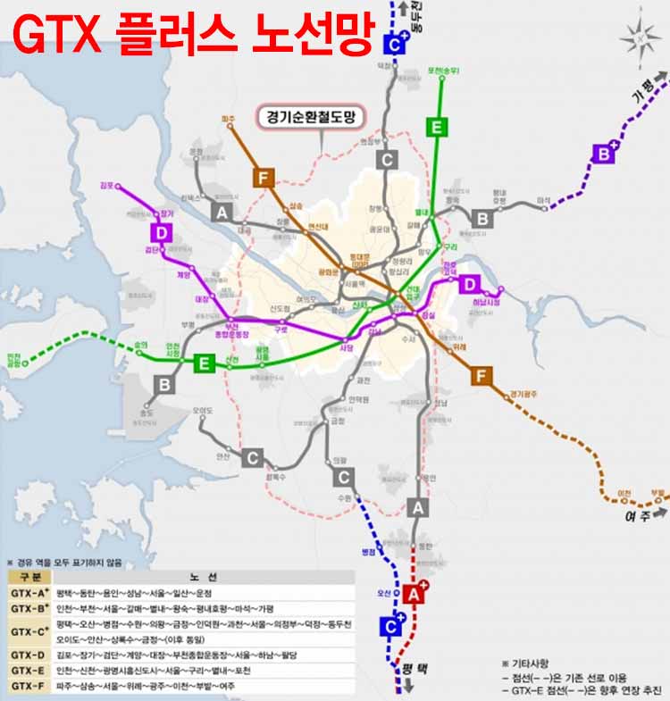 GTX 플러스 구축계획은 기존에 추진중인 GTX-A, B, C노선의 수혜를 받지 못하는 지역에 D, E, F노선을 신설해 수도권 전 지역이 GTX 형향권에 들어갈 수 있게 하는 계획으로 수도권을 평균 30분대 생활권으로 연결하는 프로젝트입니다. 이 용역을 통해 수립된 노선 안으로 향후 국토교통부와 협의해 제5차 국가철도망 구축계획에 반영될 수 있도록 최적의 노선을 찾게 됩니다.