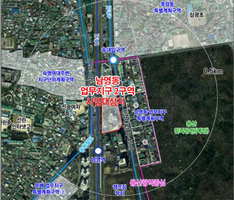 남영동 업무지구는 2010년 개발계획이 수립되었지만 그동안 사업추진이 크게 진행되지 못했습니다. 하지만 이번 남영동 업무지구 2 구역이 조합설립인가를 완료해 올해 안으로 건축심의와 사업시행인가를 준비할 계획입니다. 이 사업지는 현재 지상 34층 규모로 아파트 565세대와 오피스텔 80실 등이 계획돼 있습니다.