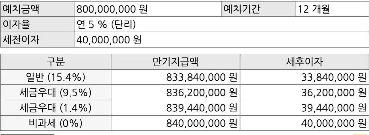 아래는 은행에 8억 원을 예치해 연 5%의 이자율을 적용해 나온 금액입니다.