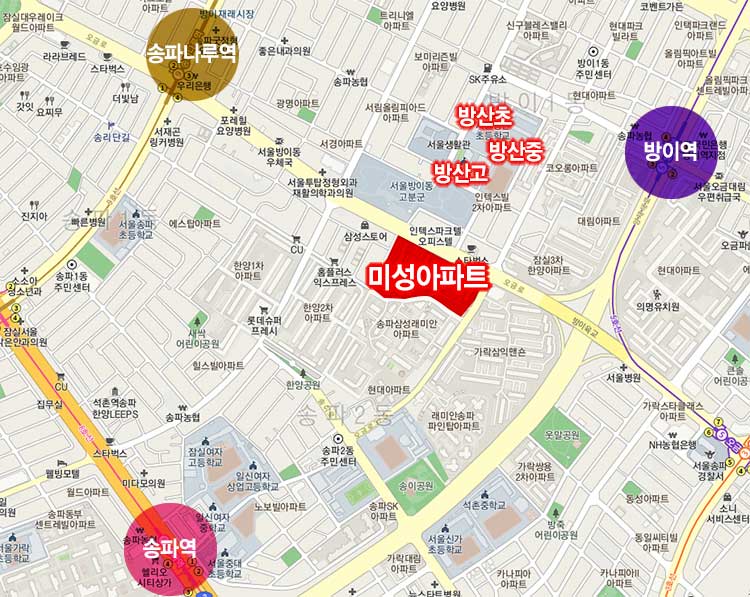 송파미성 아파트는 지하철 5호선 방이역과 9호선 송파나루역, 8호선 송파역 사이에 위치해 있어 대중교통 이용이 편리합니다. 거리상 보면 방이역이 약 510m, 송파나루역이 660m, 송파역이 910m 정도에 있습니다. 학교는 방산초등학교, 방산중학교, 방산고등학교가 인접해 있고 주변으로 가락중학교, 석촌중학교, 가락고등학교 등 다수의 교육시설이 위치해 있어 우수한 교육환경을 갖추고 있습니다. 또한 인근에는 송이공원, 옷말공원 등의 작은 공원부터 오금공원, 올림픽공원, 석촌호수 등이 인접해 있어 자연환경도 누릴 수 있고 잠실 생활권을 이용할 수 있어 우수한 인프라도 갖춰져 있습니다.